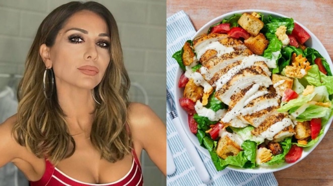 Το μεσημεριανό της: Σαλάτα με παντζάρια και τυρί χαμηλών λιπαρών ή σαλάτα σπανάκι-ρόκα και κοτόπουλο ή ψάρι ή με μανιτάρια ή με ψητά λαχανικά