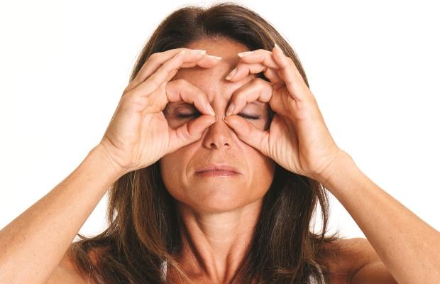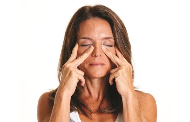 Τοποθετήστε τους δύο δείκτες στο εξωτερικό άκρο του φρυδιού. Βάλτε τα μεσαία δάχτυλα ακριβώς κάτω από το εσωτερικό άκρο του ματιού. Πιέστε ελαφρά τα δάχτυλα. Κλείστε τα μάτια και κοιτάξτε ψηλά.