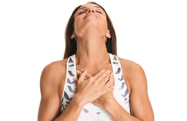 Τοποθετήστε το ένα χέρι επάνω στο στέρνο, με όλα τα δάχτυλα ενωμένα εκτός από τον αντίχειρα. Τοποθετήστε το άλλο χέρι από πάνω κατά τον ίδιο τρόπο. Στρέψτε το πηγούνι προς το ταβάνι. Πιέστε με τα χέρια ελαφρώς προς τα κάτω. Προσπαθήστε να χαμογελάσετε, κρατώντας τα χείλη ενωμένα.