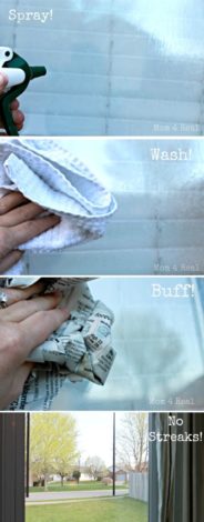 Το μόνο που έχετε να κάνετε είναι να χρησιμοποιήσετε νερό, ξύδι και σαπούνι πιάτων. Ανακατέψτε αυτά τα τρία συστατικά και τα παράθυρά σας θα είναι λαμπερά. Επίσης, θυμηθείτε να χρησιμοποιήσετε εφημερίδα. Ψεκάστε τα παράθυρα με το μείγμα, χρησιμοποιήστε ένα λευκό πανί για να τα πλύνετε και στη συνέχεια στεγνώστε τα με την εφημερίδα.