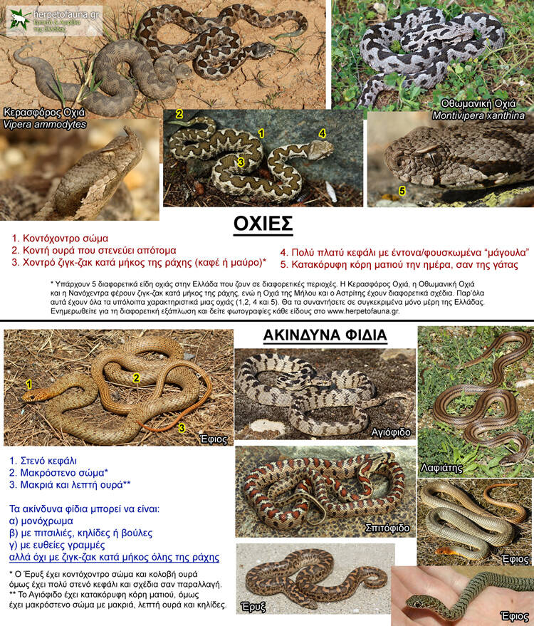 Στην Ελλάδα ζουν περίπου 70 είδη ερπετών. Από αυτά μόνο τα 7 φέρουν δηλητήριο και όλα τους είναι είδη φιδιών. Τα πέντε εξ αυτών ανήκουν στην οικογένεια των Εχιδνιδών (οχιές) και είναι σωληνόγλυφα με σχετικά ισχυρό δηλητήριο. Τα υπόλοιπα ανήκουν στην οικογένεια των Κολουβρίδων και είναι οπισθόφλυφα με ασθενές δηλητήριο, ακίνδυνα δηλαδή για τον άνθρωπο. Στη χώρα μας υπάρχουν 23 διαφορετικά είδη φιδιών. Τα φίδια της οικογένειας των Εχιδνιδών δεν βρίσκονται όλα μαζί στο ίδιο μέρος αλλά έχουν διαφορετική εξάπλωση ανά την ελληνική επικράτεια και είναι τα εξής: οχιά – vipera ammodytes, οθωμανική οχιά – montivipera xanthina, οχιά της Μήλου – macrovipera schweizeri, αστρίτης – vipera berus και η οχιά της Πίνδου (νανόχεντρα – vipera graeca). Οι δηλητηριώδεις Κουλουβρίδες είναι μόνο ο σαπίτης – malpolon insignitus και το αγιόφιδο – telescopus fallax. Αρκετές πληροφορίες μπορείτε να βρείτε στο hespetofauna.gr που υπάρχει και ο παρακάτω μίνι οδηγός αναγνώρισης των επικίνδυνων και μη φιδιών.