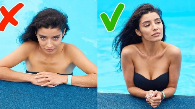 Εάν οι κοιλιακοί σας δεν είναι τέλειοι, αυτό το κόλπο θα σας βοηθήσει πάντα να τους κρύψετε. Μπείτε στο νερό μέχρι τη μέση σας, έτσι θα αναδείξετε το όμορφο μπούστο σας αντί για τις προβληματικές περιοχές σας. Επίσης, βεβαιωθείτε ότι ο λαιμός σας είναι όσο το δυνατόν περισσότερο ορατό και ότι ποτέ δε βάζετε το πηγούνι σας στον ώμο σας: το πρόσωπό σας θα φαίνεται μεγαλύτερο και ο λαιμός σας – μικρότερος και παχύτερος.