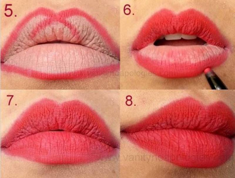 Βήμα 2: Και εδώ, χρειάζεσαι το κόκκινο μολύβι χειλιών. Πάρε το μολύβι σου και φτιάξε το περίγραμμα των χειλιών σου. Οι γραμμές και οι κουκίδες από το προηγούμενο βήμα, θα σε βοηθήσουν. Ύστερα, γέμισε τα χείλια σου, χρησιμοποιώντας το μολύβι των χειλιών σου. Σε αυτό το σημείο, κόψε χαρτί υγείας, ταμπόναρε τα χείλη σου και επανέλαβε το γέμισμα.