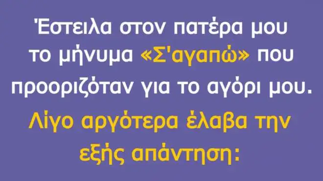 – Σήμερα, επέλεξα λάθος αριθμό και έστειλα κατά λάθος στον μπαμπά μου ένα μήνυμα που έγραφε “Σ’ αγαπώ.” Το μήνυμα προοριζόταν για τον σύζυγό μου. Λίγα λεπτά αργότερα, έλαβα την απάντηση “Και εγώ σ’ αγαπώ.” Ήταν τόσο συγκινητικό. Λέμε τόσο σπάνια τέτοια πράγματα ο ένας στον άλλον.