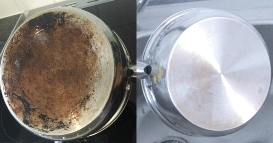 Μια άλλη λύση είναι να καθαρίσετε τις βρώμικες κατσαρόλες σας ή τις κατσαρόλες και τα τηγάνια με καμμένο πάτο με το παρακάτω μείγμα. Ανακατέψτε μέσα στο βρώμικο σκεύος μερικές σταγόνες απορρυπαντικού πιάτων, 2 κ.σ. μαγειρική σόδα και αρκετό νερό. Βάλτε το σκεύος στο μάτι της κουζίνας και ανάψτε το. Μόλις πάρει μια βράση βγάλτε το από το μάτι. Πάρτε μια παλιά οδοντόβουρτσα ή ένα σκληρό σφουγγάρι και αρχίστε το τρύψιμο. Δεν θα σας πάρει πάνω από 45 δευτερόλεπτα να το κάνετε και πάλι λαμπίκο. Δείτε και το video που ακολουθεί για να καταλάβετε καλύτερα την όλη διαδικασία.