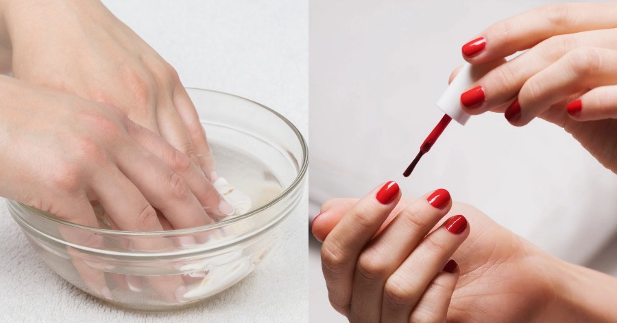– Αν στα νύχια έχουν μείνει υπολείμματα απ’ το προηγούμενο μανό, αφαιρέσετε τα βουτώντας τα σε ένα μπολ με διάλυμα από ζεστό νερό, οξυζενέ και μαγειρική σόδα, για ένα λεπτό. Διαφορετικά, βουτήξτε τα απλά σε ζεστό νερό για να μαλακώσουν τόσο τα νύχια όσο και τα πετσάκια.