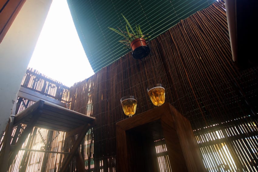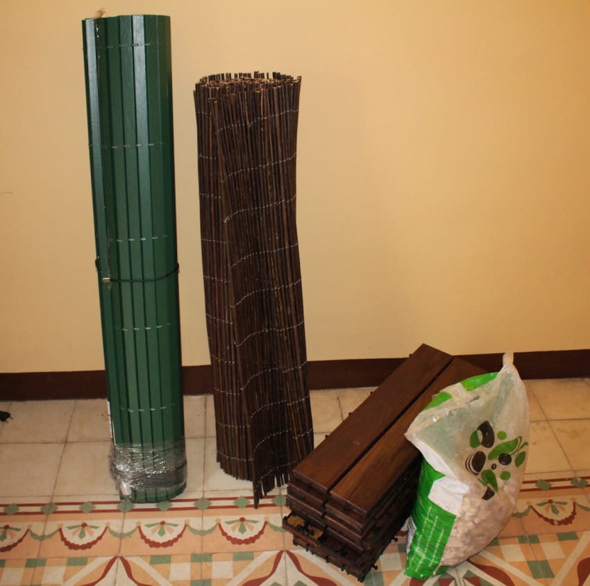 Με λιγότερο από 50 ευρώ, αγόρασε ξύλινες σανίδες, ψάθα, λευκά βότσαλα και περσίδες.