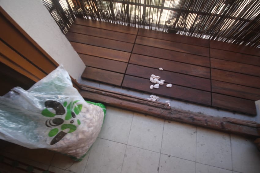 Στο κενό ανάμεσα στις σανίδες και τη μπαλκονόπορτα, τοποθέτησε λευκά βότσαλα.