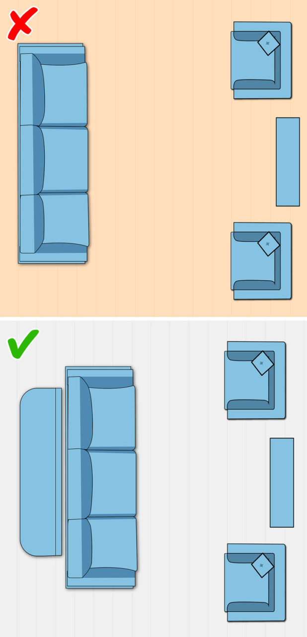 – Βγάλτε τα έπιπλά σας από τον τοίχο για να κάνετε το δωμάτιο να φαίνεται μεγαλύτερο: Ένα πολύ συνηθισμένο λάθος είναι ότι θεωρείται ότι πρέπει να βάλετε όλα τα έπιπλα στον τοίχο για να έχετε περισσότερο χώρο για να κινήστε. Η αλήθεια είναι εντελώς αντίθετη: εάν τοποθετήσετε τα έπιπλά σας μακριά από τους τοίχους, θα έχετε περισσότερο χώρο για να αναπνέει το δωμάτιο, έναν πρόσθετο χώρο για κίνηση και περισσότερη οικειότητα μεταξύ εσάς και των καλεσμένων σας. Για να αποφύγετε την εμφάνιση του πίσω μέρους του καναπέ, μπορείτε να προσθέσετε ένα μπουφέ και να βάλετε μερικά διακοσμητικά σε αυτό.