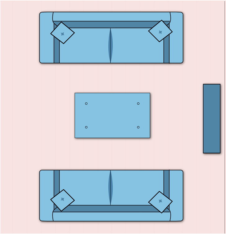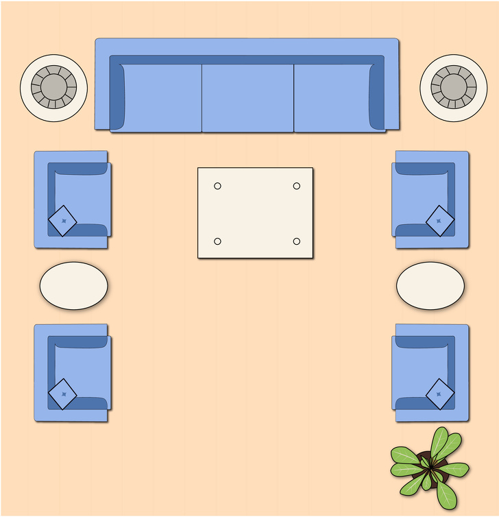 – Διαρρύθμιση με χώρο για τραπέζια: Αυτός ο σχεδιασμός έχει σχήμα “U” και μπορεί να προσαρμοστεί πλήρως σε ένα μικρό σαλόνι, εάν έχετε μικρά έπιπλα. Το κόλπο εδώ είναι ότι ο καθένας που κάθεται έχει το δικό του τραπέζι. Μπορείτε να το δημιουργήσετε με μια υπερμεγέθη πολυθρόνα για 2 άτομα, 2 έως 4 καρέκλες (ανάλογα με το μέγεθος του δωματίου σας), 2 μικρά τραπέζια μεταξύ τους και ένα τραπεζάκι. Αυτή είναι σίγουρα μια καλή επιλογή εάν οργανώνεται πολλά πάρτι.