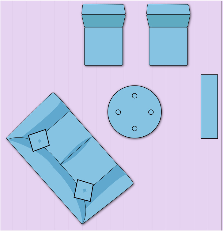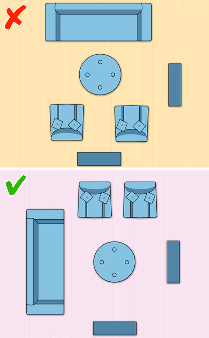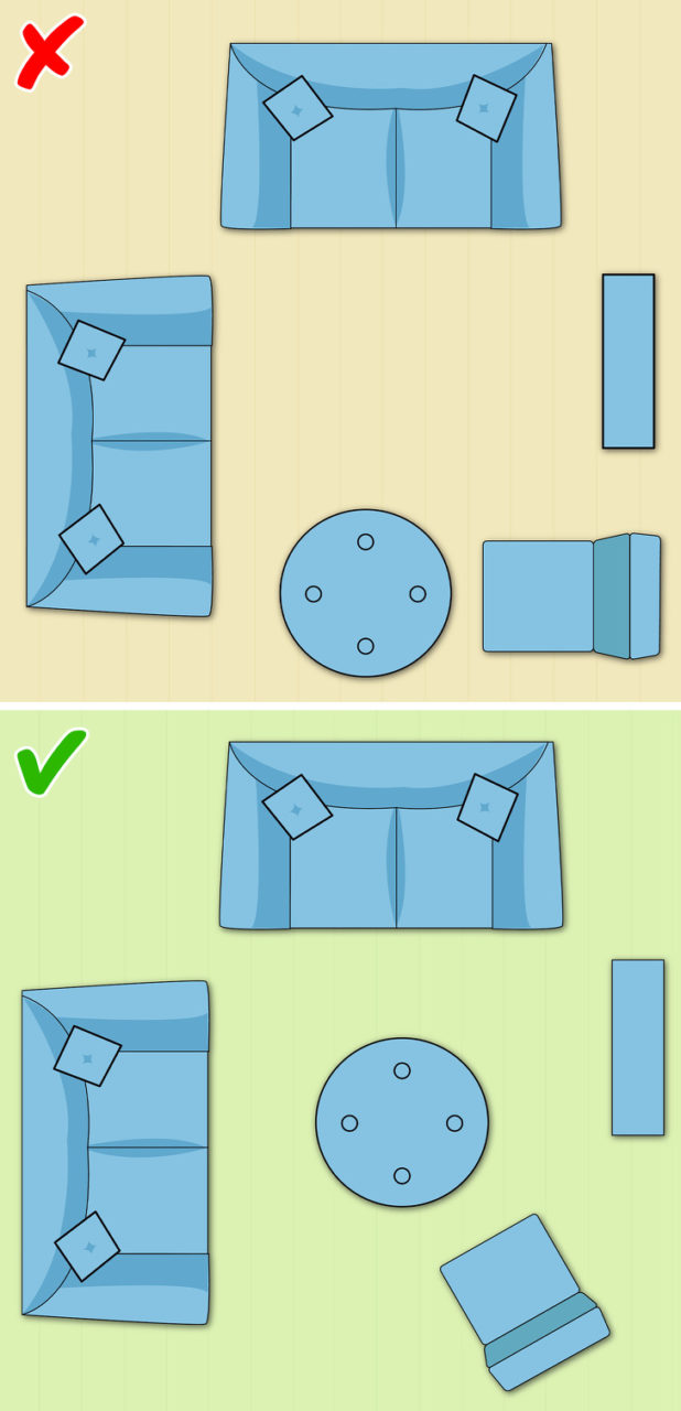 – Η διαγώνια διαρρύθμιση: Βελτιώστε την κίνηση στο σαλόνι σας χρησιμοποιώντας μια διαγώνια διάταξη για τα έπιπλά σας, ειδικά εάν το σαλόνι σας είναι τετράγωνο. Είναι αισθητικά ισορροπημένη, εξοικονομεί χώρο και είναι πολύ εύκολο να διαρρυθμιστεί. Απλά περιστρέψτε τα έπιπλά σας υπό γωνία 45 °.