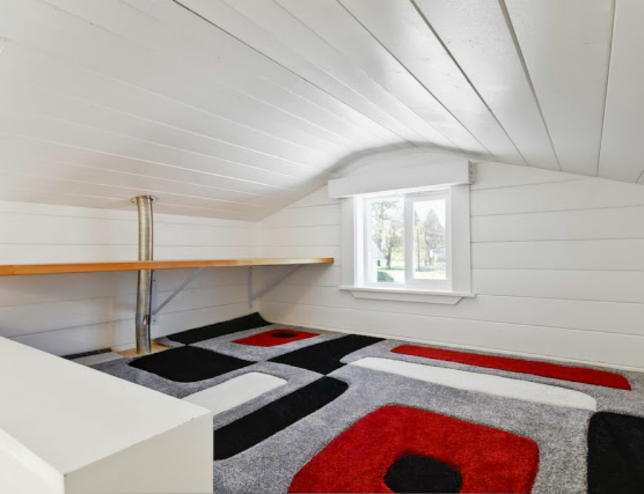 12. Αυτός ο χώρος βρίσκεται ακριβώς απέναντι από το υπνοδωμάτιο. Είναι επενδυμένος με μια μοκέτα με έντονα, παιχνιδιάρικα, γεωμετρικά σχήματα. Θα μπορούσε να χρησιμοποιηθεί είτε για υπνοδωμάτιο, είτε για χώρο γραφείου.