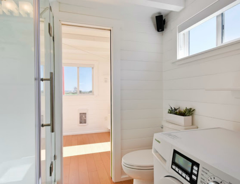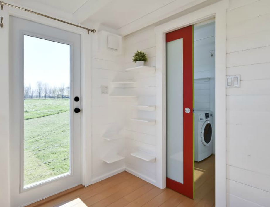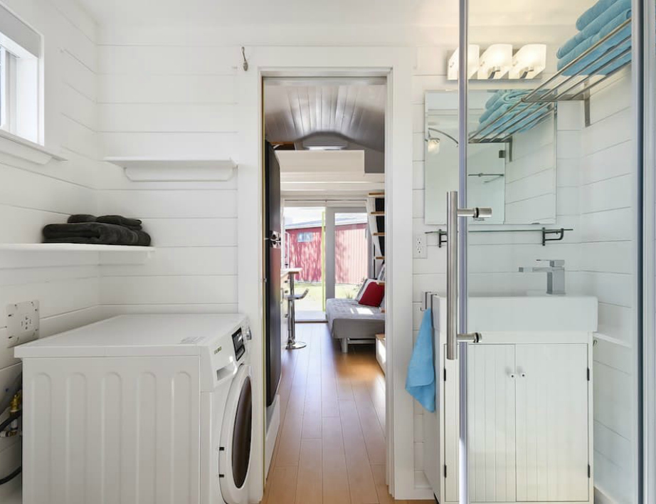 6. Στο βάθος πέρα από την κουζίνα βρίσκεται το μπάνιο, το οποίο διαθέτει αρκετά ράφια για την αποθήκευση των ειδών μπάνιου, καθώς και επιπλέον χώρο για το πλυντήριο ρούχων.