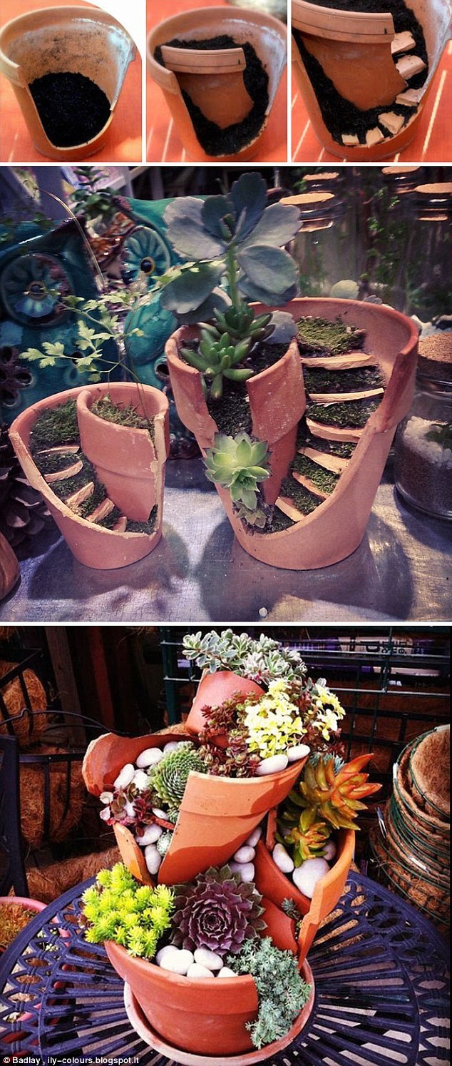 Αν οι γλάστρες έσπασαν μην τις πετάξεις. Βάλε τα σπασμένα κομμάτια, έτσι ώστε να μοιάζουν με σκαλάκια ή κάνε έναν συνδυασμό από γλάστρες.