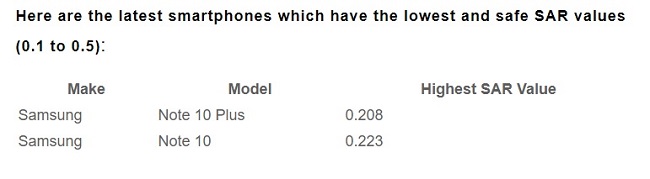 Το Mi Note 10 και της LG το LG G8X ThinQ, αλλά και τα iphone 11 Pro και iphone 11, Samsung S 10 και το Nokia 9 εκπέμπουν την μικρότερη ακτινοβολία. Την λίστα με την μικρότερη ακτινοβολία κλείνει το Huawei P30 Pro με 0,99 watt. Σύμφωνα με την Ομοσπονδιακή Επιτροπή Επικοινωνίας ένας άνθρωπος δεν μπορεί να απορροφήσει περισσότερα από 1,6 watt ενέργειας ανά χιλιόγραμμο σωματικού βάρους. Μάλιστα, το δημοσίευμα αναφέρει πως το κινητό με την μικρότερη ακτινοβολία μεταξύ των υπολοίπων είναι το Samsung Note 10 και Note10 plus.