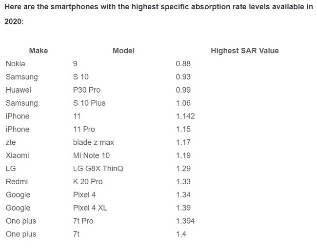 Σύμφωνα λοιπόν με τη σχετική λίστα του δημοσιεύματος το smartphone που έρχεται πρώτο σε εκπομπή ακτινοβολίας είναι το One plus 7T. Πρόκειται για κινητό του κινέζικου ομίλου με 1,4 watt. Στη δεύτερη θέση είναι επίσης της εταιρείας One Plus. Πρόκειται για το κινητό τηλέφωνο One Plus 7t Pro με 1,394 watt. Στον κατάλογο με τα κινητά που εκπέμπουν τη μεγαλύτερη ακτινοβολία για το 2020 είναι κινητά τηλέφωνα της Google. Συγκεκριμένα, το Pixel 4 XL με 1,39 watt και το Pixel 4 με 1,34 watt.