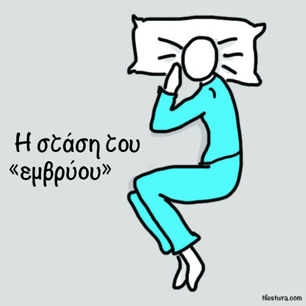 – Η στάση του «εμβρύου»: Αποτελεί μια από τις πιο δημοφιλείς στάσεις ύπνου καθώς, σύμφωνα με ερευνητές 58% των ανθρώπων την προτιμούν. Η στάση του εμβρύου δείχνει έναν άνθρωπο ευσυνείδητο και οργανωμένο όμως μπορεί πολλές φορές να ανησυχεί υπερβολικά και σκέφτεται πολύ.