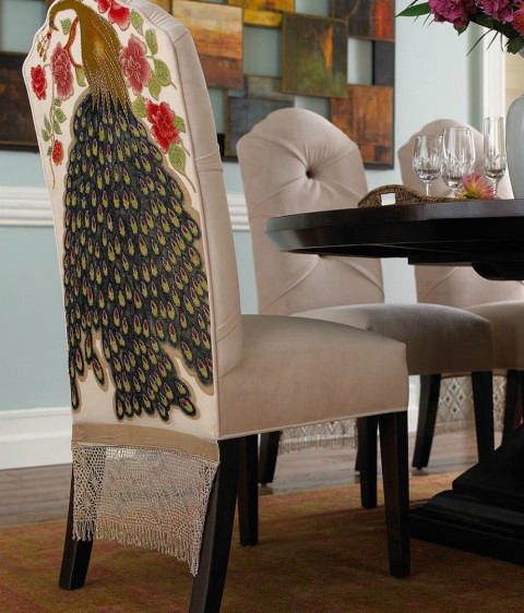 Στη διακόσμηση των καρεκλών σας έχετε πάλι αρκετές επιλογές. Μπορείτε να χρησιμοποιήσετε παρόμοια φουλάρια (αν διαθέτετε αρκετά στο ίδιο στιλ) για να τις ντύσετε στο πίσω μέρος. Ράψτε τα φουλάρια πάνω στο πίσω μέρος της καρέκλας και αφήστε τα κρόσσια τους να κρέμονται για έξτρα πόντους στιλ.