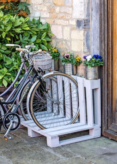 – DIY κατασκευή για σταντ ποδηλάτων στο σπίτι: Για τον εξωτερικό χώρο ή το γκαράζ μπορείς να φτιάξεις ένα σταντ για ποδήλατα. Η εκτέλεση είναι πολύ απλή επομένως δε θα δυσκολευτείς καθόλου. Μπορείς να βάψεις τις παλέτες για πιο όμορφο αποτέλεσμα!