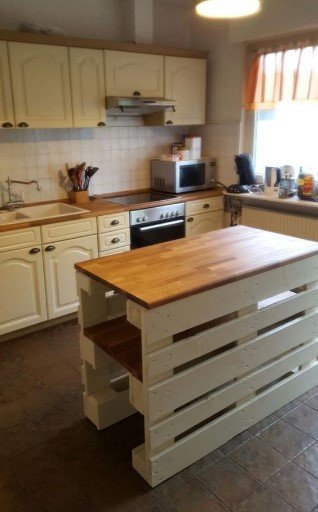 – Πάγκος κουζίνας από ξύλινες παλέτες: Μια πρόταση για την κουζίνα είναι να φτιάξεις έναν επιπλέον πάγκο από παλέτες. Βάψε τις στο χρώμα των υπόλοιπων επίπλων και πρόσθεσε το ίδιο υλικό στην επιφάνεια του πάγκου για να ταιριάζει ακριβώς στον χώρο. Ένας κανονικός πάγκος κουζίνας θα σου κόστιζε πολλά λεφτά επομένως με τη κατασκευή αυτή θα εξοικονομήσεις αρκετά χρήματα!