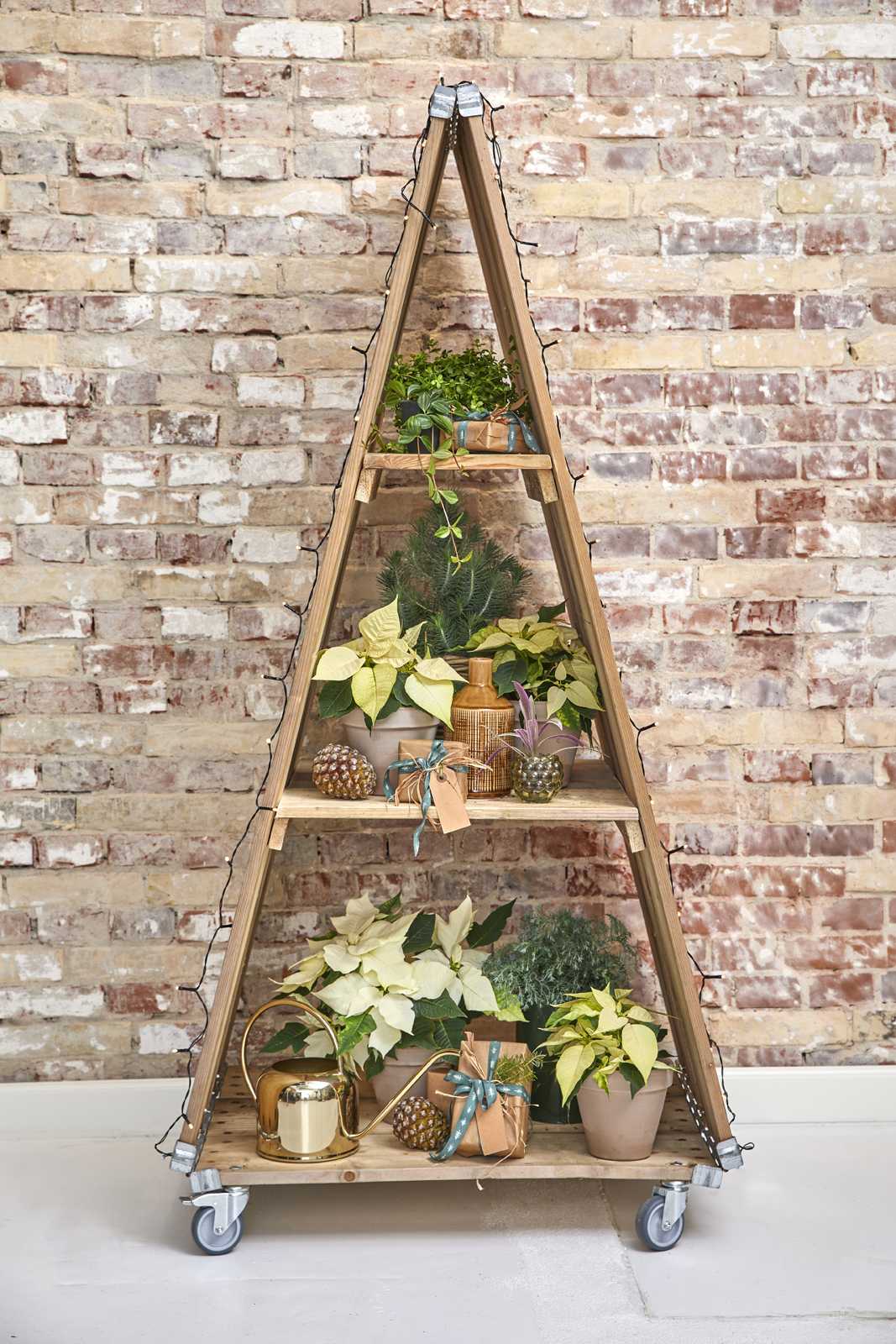 Το τριγωνικό σχήμα της βιβλιοθήκης καθιστά αυτό το απλό ξύλινο ράφι ιδανικό υποκατάστατο χριστουγεννιάτικου δέντρου για όποιον θέλει μια επαναχρησιμοποιούμενη εναλλακτική στο κλασικό έλατο. Για να το διακοσμήσετε, γεμίστε τα ράφια με πουρνάρια, κώνους, πράσινα φυλλώδη φυτά, δώρα και χριστουγεννιάτικα στολίδια και, στη συνέχεια, προσθέστε μια σειρά από φωτάκια. Έτοιμο! Οι ρόδες σας επιτρέπουν να μετακινείτε αυτό το μινιμαλιστικό υποκατάστατο δέντρου όπου τραβάει περισσότερο την προσοχή.