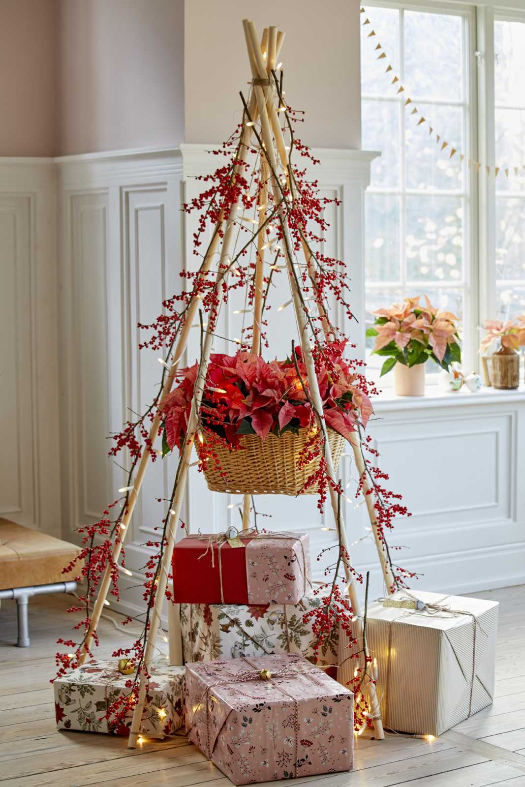 Αυτό το χειροποίητο χριστουγεννιάτικο δέντρο, διακοσμημένο με λιόπρινο και φωτάκια, είναι ταυτόχρονα υπέροχα ρομαντικό και μοντέρνο. Αποτελείται από πέντε φυσικούς λεπτούς κορμούς μήκους 1,8 μ., δεμένους μεταξύ τους στη μία άκρη και στημένους σαν σκηνή. Το κεντρικό σημείο είναι το καλάθι στη μέση που φιλοξενεί αλεξανδρινά. Για εξοικονόμηση χώρου μπορείτε να τοποθετήσετε τα δώρα κάτω από το ξύλινο πλαίσιο.