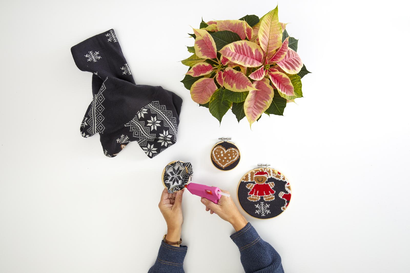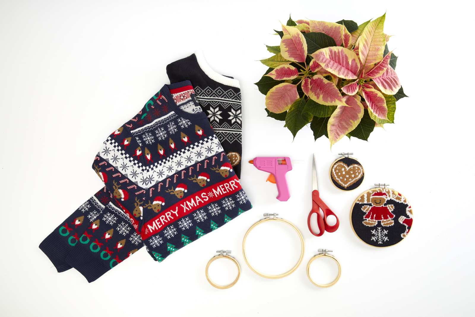 Θα χρειαστείτε ένα παλιό χριστουγεννιάτικο πουλόβερ, ψαλίδι, τελάρα κεντήματος, θερμόκολλα και πιστόλι θερμόκολλας.