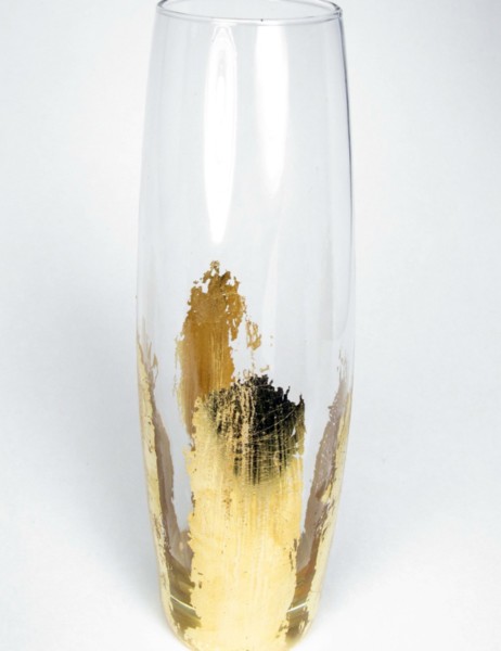 – Λαμπερό βάζο από φύλλα χρυσού: Τι θα χρειαστείτε: ένα βάζο ή ένα ποτήρι, φύλλα χρυσού, κόλλα για φύλλα χρυσού και ένα πινέλο. Ξεκινήστε περνώντας με πινέλο τα σημεία του βάζου που θέλετε να κάνετε χρυσά. Αφήστε την κόλλα να στεγνώσει για 2-3 λεπτά. Έπειτα βάλτε από πάνω κάθε φύλλο χρυσού και περάστε σε όλα τα σημεία που έχετε βάλει κόλλα. Πάρτε ένα πινέλο ή ένα σφουγγαράκι και πιέστε σε όλα τα σημεία για να κολλήσει καλά το φύλλο και να είναι ενιαίο σε όλη την επιφάνεια. Σε μερικά λεπτά έχετε έτοιμο ένα υπέροχο βάζο.