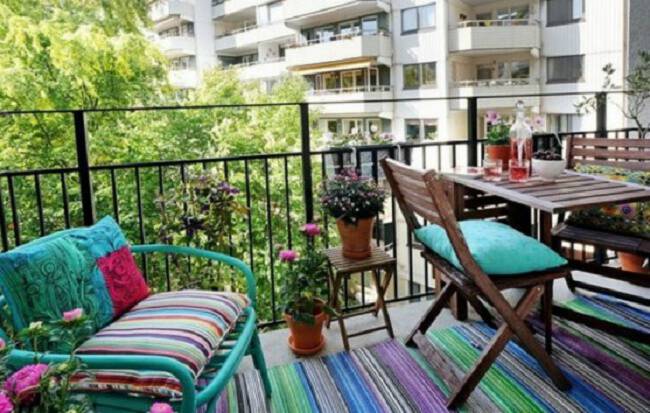 Το χαλί μπορεί να χρησιμοποιηθεί χειμώνα καλοκαίρι στο μπαλκόνι σας και προσθέτει στιλ και άποψη. Βρείτε ένα κιλίμι ή κουρελού και τοποθετήστε το μπροστά από τις καρέκλες ή το παγκάκι σας. Βάζοντας ένα τέτοιο χαλί (που είναι και εύκολο να το σηκώσετε όταν θέλετε να πλύνετε) ο χώρος γεμίζει και μπορείτε να μην χρησιμοποιήσετε κανονικό τραπέζι. Ένα μικρό τραπεζάκι δίπλα στις καρέκλες φτάνει.