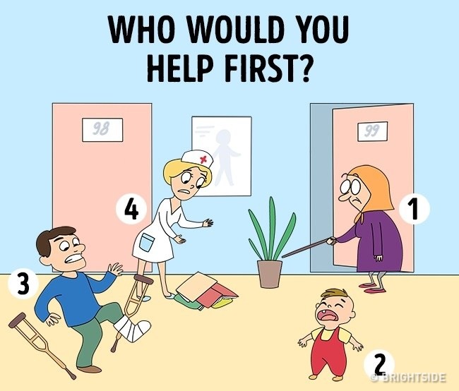 Με την βοήθεια της εικόνας από τον ιστότοπο του Brightside και την Ekaterina Gapanovich, μπορείτε να ανακαλύψετε, με βάση την πρώτη επιλογή σας στο ερώτημα ποιο άτομο από τα τέσσερα θα βοηθούσατε πρώτο, στοιχεία της προσωπικότητας σας, που μπορεί να μην γνωρίζατε.