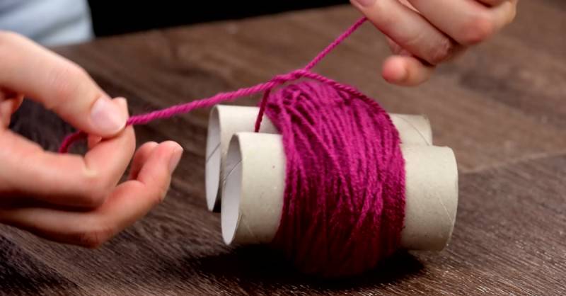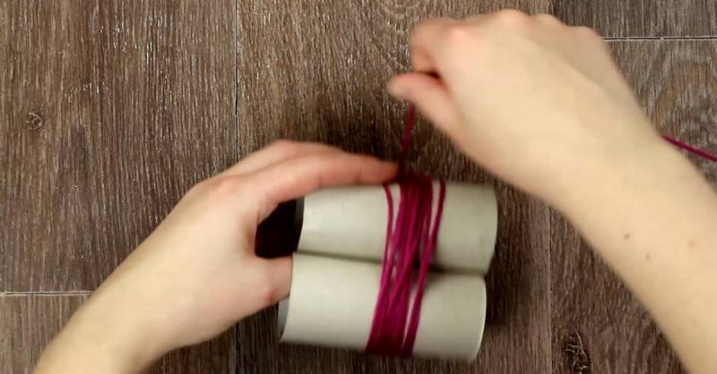 Επιλέξτε κλωστές στα χρώματα που θέλετε το χαλάκι σας. Πάρτε δύο άδεια χάρτινα ρολά και τυλίξτε το νήμα γύρω τους όπως στη φωτογραφία: