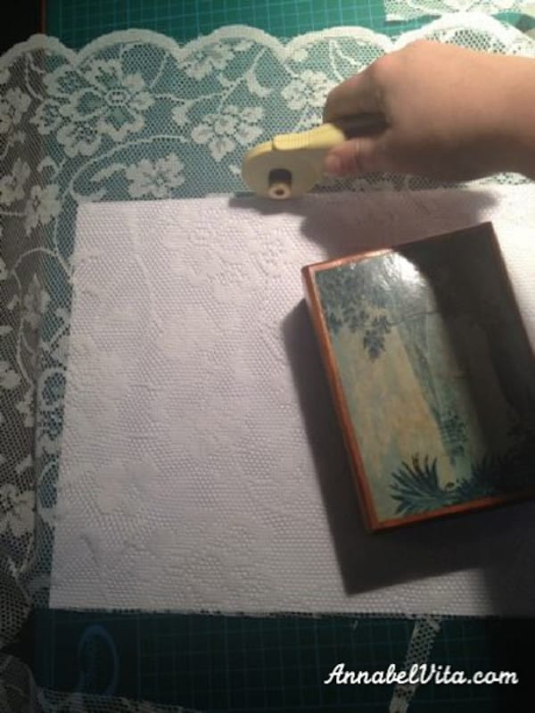 Αρχικά, έκοψε ένα τετράγωνο κομμάτι δαντέλας και το έβαλε πάνω στο παράθυρο, προσέχοντας να μην έχει ζάρες.
