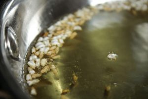 Αν θέλετε να ελέγξετε αν το λάδι είναι αρκετά καυτό για να τηγανίζετε κάτι, πετάξτε μερικούς κόκκους ρυζιού σε αυτό. Αν το λάδι είναι πολύ κρύο, το ρύζι θα βυθιστεί. Αν είναι σε σωστή θερμοκρασία, το ρύζι θα επιπλεύσει και θα τσιτσιρίσει. Μπορείτε να αφαιρέσετε τους κόκκους στη συνέχεια από το λάδι με ένα κόσκινο ή μια τρυπητή κουτάλα.
