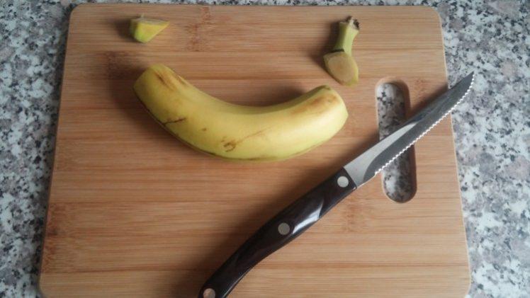 – Πλύνετε την με νερό καλά. Μετά απλά κόψτε τις δύο άκρες της μπανάνας (πάνω και κάτω), όπως φαίνεται παρακάτω: