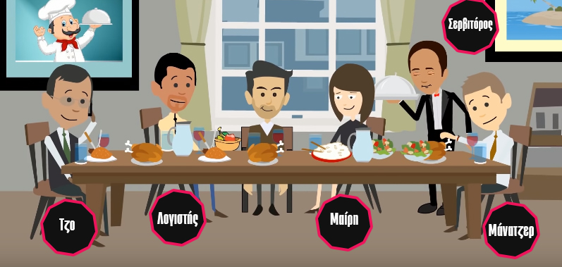 Στο δείπνο ήταν παρόντες ο Τζο, ο συνέταιρος του Τζον στο εστιατόριο, ο μάνατζερ του εστιατορίου, η Μαίρη, η σύζυγος του Τζον, ο λογιστής του εστιατορίου και ο σερβιτόρος του δείπνου.