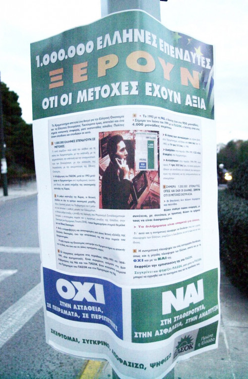 Το πάρτι του χρηματιστηρίου είχε –εννοείται– και τις ευλογίες του ΠΑΣΟΚ που ήταν τότε στην κυβέρνηση: κορυφαία στιγμή, τον Ιούνιο του 1999, όταν κυκλοφορεί προεκλογική αφίσα για τις ευρωεκλογές με τίτλο «Σήμερα 1.000.000 επενδυτές ξέρουν ότι οι μετοχές τους έχουν αξία».