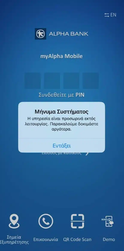 Πιο αναλυτικά η Alpha Bank αυτή την ώρα είναι χωρίς e-banking, καθώς το σύστημα έχει κρασάρει και δε λειτουργούν σωστά σημαντικές υπηρεσίες της με το προσωπικό της τράπεζας να προσπαθεί να επιδιορθώσει την κατάσταση.