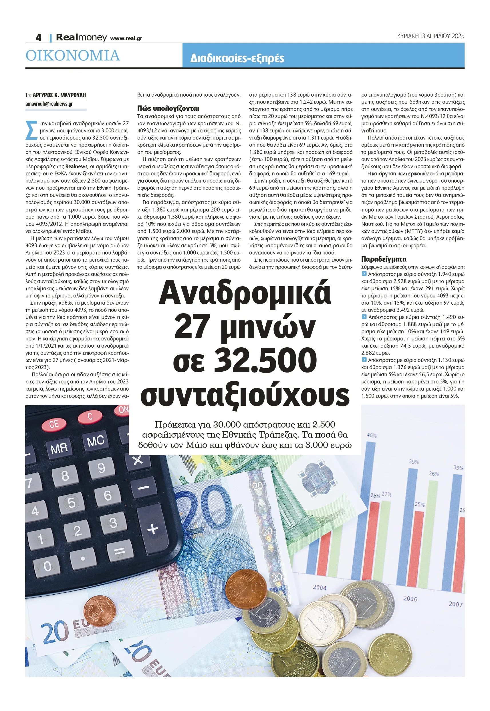 Ο e-ΕΦΚΑ έχει ήδη ξεκινήσει τη διαδικασία επανυπολογισμού των συντάξεων για περίπου 2.500 συνταξιούχους της Εθνικής Τράπεζας, ενώ ακολουθεί ο υπολογισμός για περίπου 30.000 απόστρατους, βάσει των προβλέψεων του νόμου 4093/2012. Τα αναδρομικά ποσά που προκύπτουν από τη διακοπή των κρατήσεων στα μερίσματα και την ανακατανομή των ποσοστών περικοπής φτάνουν ακόμη και τα 3.000 ευρώ για κάποιους συνταξιούχους. Η κατάργηση των μειώσεων από τα μερίσματα τέθηκε σε εφαρμογή αναδρομικά από 1/1/2021, με αποτέλεσμα η περίοδος αναδρομικότητας να καλύπτει 27 μήνες, μέχρι τον Μάρτιο του 2023. Η αποπληρωμή των αναδρομικών αναμένεται να ολοκληρωθεί εντός Μαΐου.
