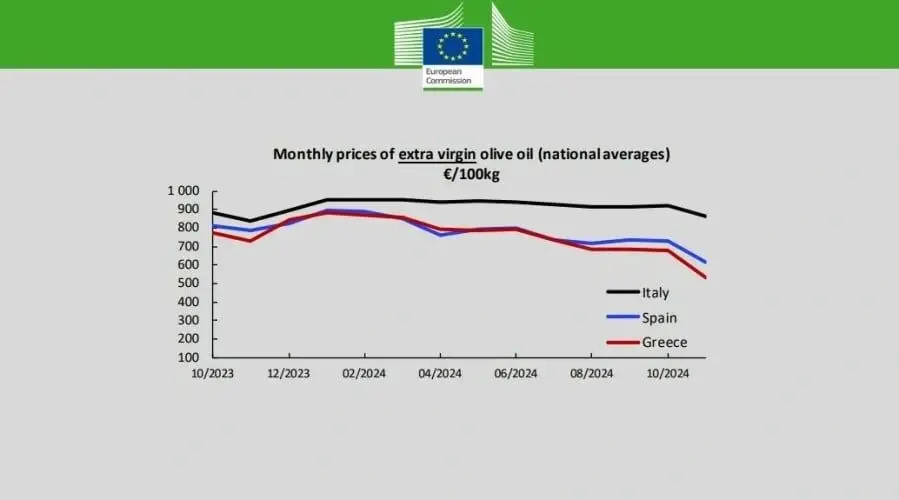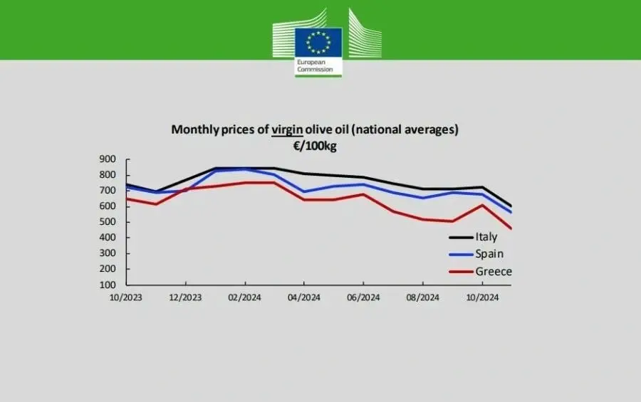 Το Νοέμβριο, η τιμή του έξτρα παρθένου ελαιολάδου στην Ελλάδα ανήλθε στα 5,33 ευρώ το κιλό, ενώ στην Ισπανία και την Ιταλία διαμορφώθηκε στα 6,15 και 8,61 ευρώ αντίστοιχα. Παρά την πτώση στις τιμές παραγωγού (5,50-6 ευρώ ανά κιλό), η λιανική παραμένει υψηλή, φτάνοντας μέχρι και τα 14 ευρώ το λίτρο, σύμφωνα με δηλώσεις παραγωγών.