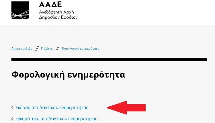 Το ψηφιακό αποδεικτικό ενημερότητας εκδίδεται από την ψηφιακή πύλη myAADE στη διαδρομή myAADE.gov.gr / Εφαρμογές / Φορολογικές Υπηρεσίες / Ενημερότητα / Έκδοση Αποδεικτικού Ενημερότητας / Είσοδος στην εφαρμογή.