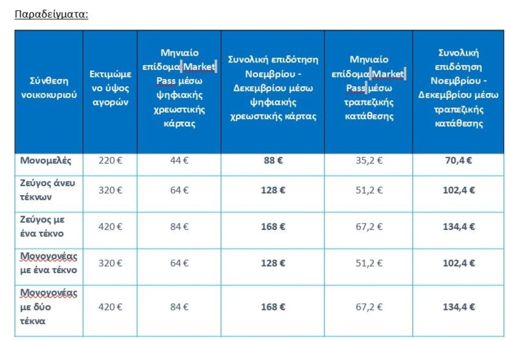 Ειδικότερα, χορηγείται ενίσχυση 20% επί του μηνιαίου ύψους αγορών. Υπενθυμίζεται πως στην καταβολή του Market Pass στο σύνολο της χώρας προβλέπεται χορήγηση 10% επί του μηνιαίου ύψους αγορών.