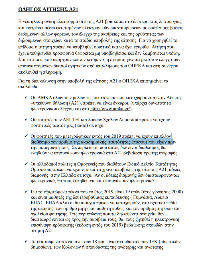 Συνεπώς, οι οικογένειες θα μπορούν να υποβάλλουν απρόσκοπτα την αίτηση Α21 παρόλο που δεν θα έχουν υποβάλλει τη φετινή δήλωση φορολογίας εισοδήματος φορολογικού έτους 2018 (έντυπο Ε1) στην ΑΑΔΕ. Η πλατφόρμα αιτήσεων Α21 θα είναι και φέτος προσβάσιμη όπως και πέρυσι μέσω της ιστοσελίδας του ΟΠΕΚΑ (www.opeka.gr) και της ΗΔΙΚΑ (www.idika.gr). Η είσοδος θα γίνεται με χρήση των προσωπικών κωδικών πρόσβασης του δικαιούχου στο TAXISnet.
