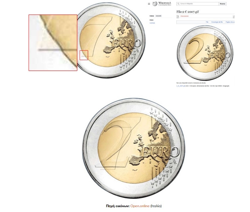 Στις εικόνες που δημοσίευσε το Ιταλικό Open, φαίνεται ξεκάθαρα πως η εικόνα του υποτιθέμενου κέρματος των 7 ευρώ έχει υποστεί ψηφιακή επεξεργασία, βάσει της καταχώρησης εικόνας του νομίσματος 2 ευρώ που βρίσκεται στη Wikipedia: