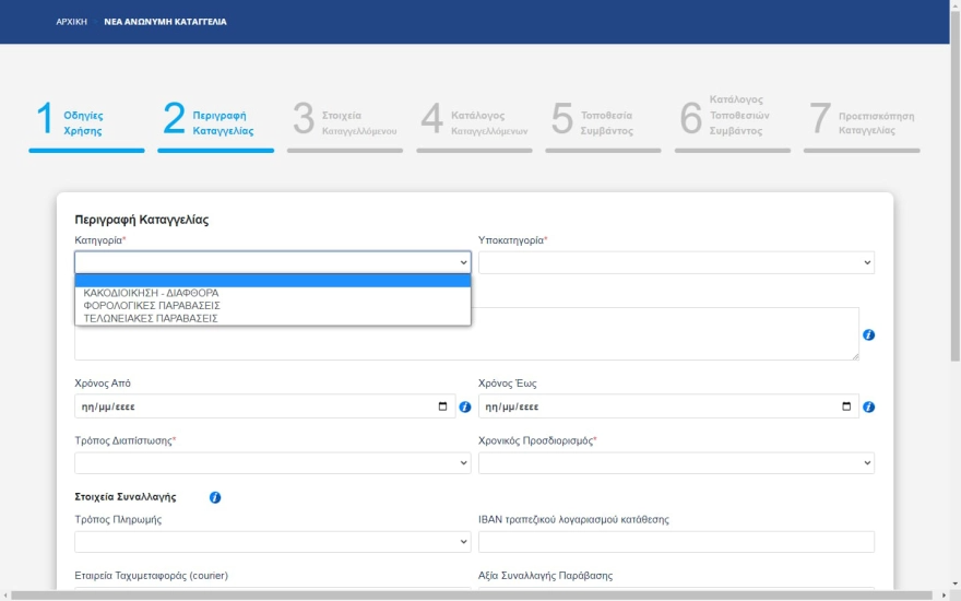 • επιλέγει αν θα πραγματοποιήσει ανώνυμη ή επώνυμη καταγγελία.