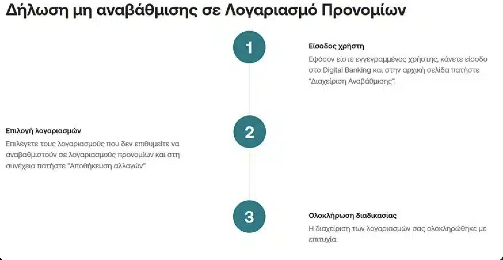 Η χρέωση θα γίνεται αυτόματα: «Για την αναβάθμιση στον Λογαριασμό Προνομίων δεν απαιτείται κάποια ενέργεια από εσάς καθώς στις 23/05/2025 οι λογαριασμοί απλό Ταμιευτήριο / απλός Τρεχούμενος στους οποίους είστε δικαιούχος θα μετατραπούν αυτόματα στον νέο Λογαριασμό Προνομίων, διατηρώντας τον ίδιο αριθμό λογαριασμού».