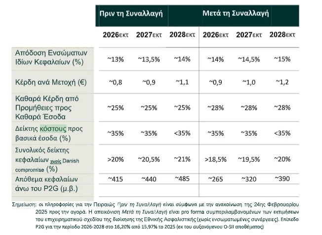 Η εξαγορά ενισχύει τη δυνατότητα της Πειραιώς να παρέχει ολοκληρωμένες λύσεις που περιλαμβάνουν τραπεζικά, επενδυτικά και ασφαλιστικά προϊόντα. Επιπλέον, σύμφωνα με τους υπολογισμούς της τράπεζας, η συναλλαγή αναμένεται να συμβάλει θετικά στον δείκτη κεφαλαιακής επάρκειας, ο οποίος εκτιμάται ότι θα φτάσει το 20% έως το 2028, εξασφαλίζοντας έτσι σημαντικό πλεόνασμα έναντι των εποπτικών απαιτήσεων.