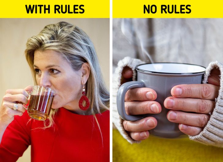 Η κατανάλωση τσαγιού έχει επίσης τη δική της εθιμοτυπία. Για παράδειγμα, δεν επιτρέπεται να επεκτείνετε το μικρό σας δάχτυλο όταν κρατάτε ένα φλυτζάνι τσαγιού. Αντ ‘αυτού, πρέπει να κρατάτε το πάνω μέρος της λαβής του με τον αντίχειρα και το δείκτη σας. Τώρα, η Μέγκαν μπορεί ελεύθερα να κρατήσει μια μεγάλη κούπα από το αγαπημένο της ρόφημα και με τα δύο χέρια για να ζεσταθεί τα κρύα βράδια.