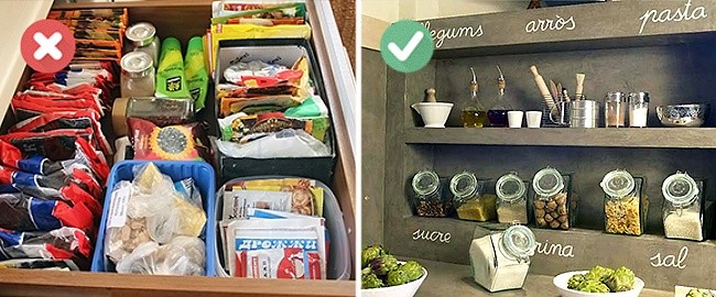 Αφαιρέστε τις συσκευασίες των τροφίμων και αποθήκευστε τα σε ομοιόμορφα διάφανα βάζα, που όχι μόνο θα βρίσκετε αμέσως αυτό που χρειάζεστε, αλλά θα φαίνονται και οργανωμένα και τακτοποιημένα.