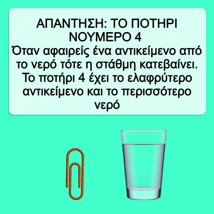 9. Ποιο ποτήρι έχει τη μεγαλύτερη ποσότητα νερού σε αυτό;