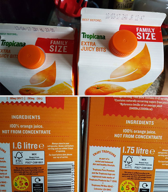 Το 2017, οι καταναλωτές άρχισαν να παρατηρούν ότι το μέγεθος των χαρτοκιβωτίων Tropicana της οικογενειακή συσκευασίας μειώθηκε κατά περίπου 9%. Παρά την αλλαγή, η τιμή παρέμεινε η ίδια.